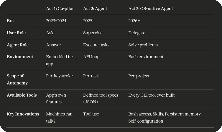 Act 1 was the Copilot era. Context windows were small and RAG was big. Every AI startup was working hard on prompt engineering to show they weren’t just a wrapper.
